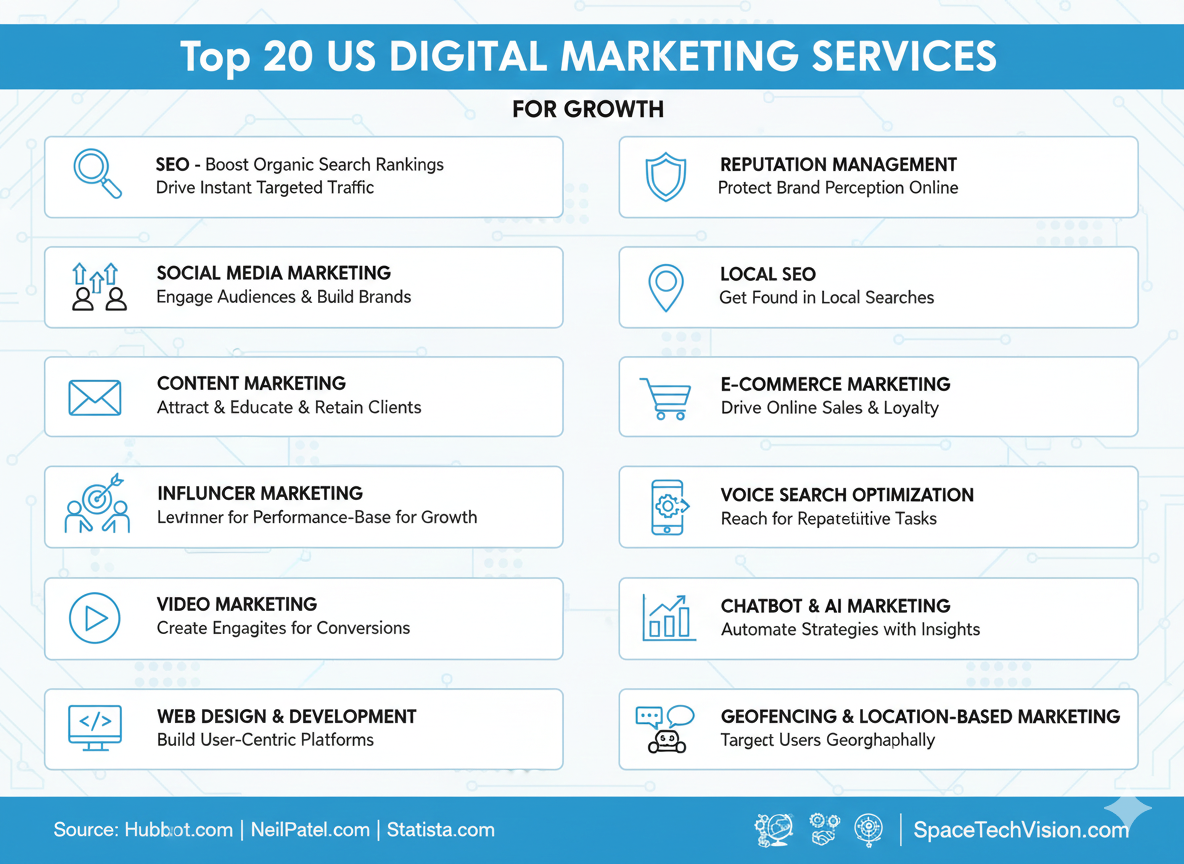 • Comprehensive Digital Solutions: Covers the top 20 digital marketing services in the US for businesses of all sizes.